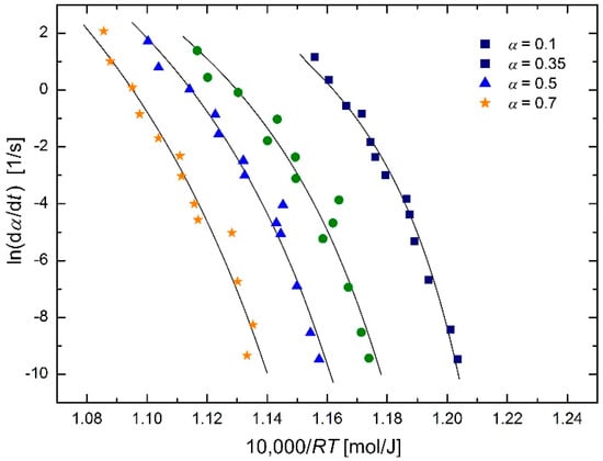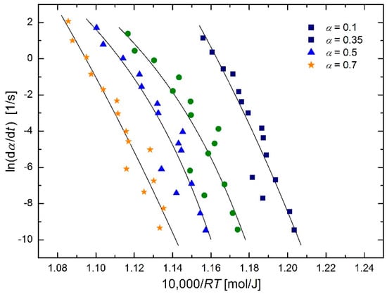 Arrhenius plot for austenitization of SA 508 Gr.3 steel using isoconversional method [2] (reduced data) based on the modified Arrhenius equation in the form of Equation (27), with common regression parameter T0 for all α values.
