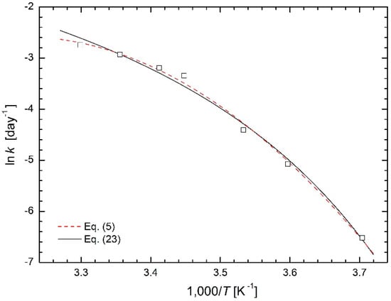 One of the classical approaches to describing curved Arrhenius plots consisted in a phenomenological description of their shape, mostly using several initial terms of convergent mathematical series in the Arrhenius equation. These were sometimes called “extended Arrhenius equations”, e.g., in [13]. Dozens of papers with extended Arrhenius equations were published especially in the 1970s and 1980s. For example, a logarithmic equation with coefficients A to E (or more) was published by Kanerva et al. [14]: