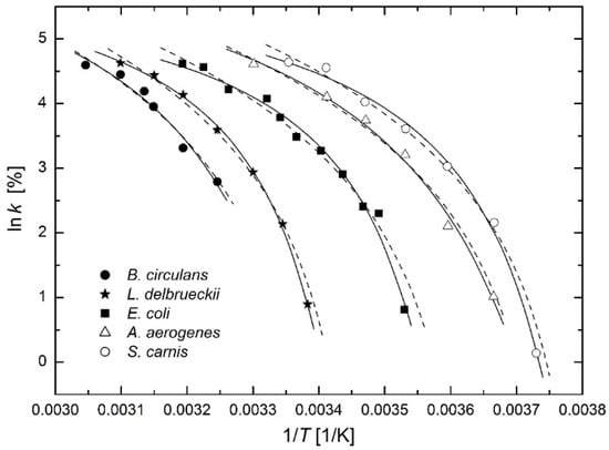 proposed by Ohta and Hirahara [30]. In Figure 12 the Arrhenius plots of relative growth rates are drawn with fits based on the modified Arrhenius Equation (23) (solid lines) and on phenomenological regression function (29) (dashed lines). The modified Arrhenius Equation (23) leads to a better fit, especially for the highest growth rates. On the other hand, with regard to the number of regression parameters (only two) and the time of publication (1977), the function (29) represented a significant advance in the phenomenological description of growth of bacterial cultures at that time.