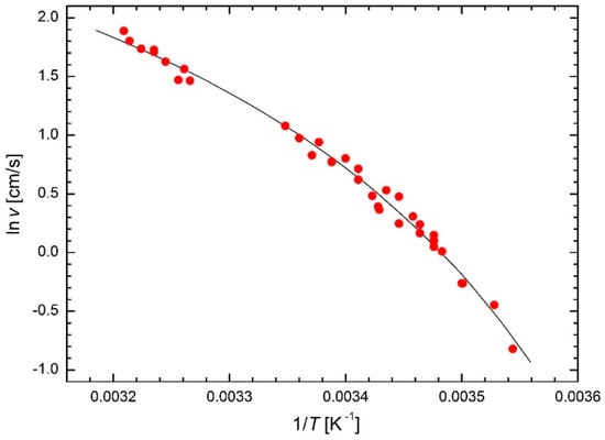 The validity of the modified Arrhenius Equation (23) can be illustrated by drawing in the plot lnk vs. 1/(T − T0) instead of in the usual plot lnk vs. 1/T where the linear course is obtained with the slope −Em/R. This is shown in Figure 4 redrawn in the plot lnk vs. 1/(T − T0), see Figure 15. A similar procedure is used in the Weibull plot when a three-parameter Weibull distribution is considered: ln x-axis is replaced by ln(x − −x0) axis, see Equation (20).