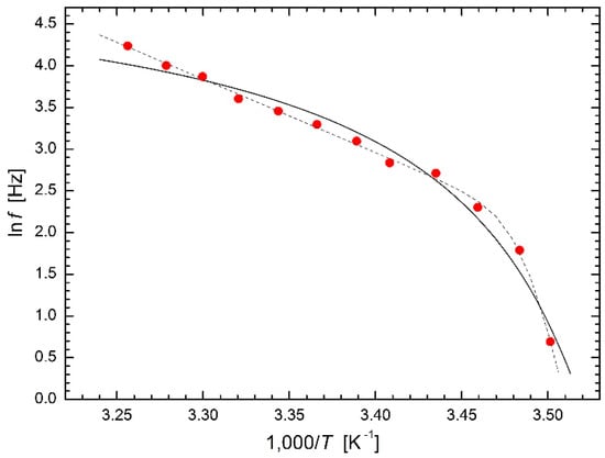 where the extension consists of an additional term of the polynomial of 1/T. All of these equations containing three or more parameters usually give a very good fit, but their regression parameters have no physical meaning, i.e., their meaningful interpretation is virtually impossible. An example application of Equation (5) (in fact, its analogy) is given in Figure 1 (dashed line).