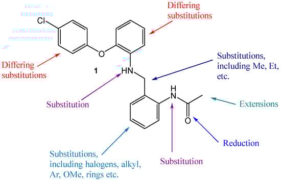 We planned to build an SAR from the various analogues synthesised based upon N-(2-([2-(4-chloro-phenoxy)phenylamino]methyl)phenyl)acetamide 1 (Figure 4). It was envisaged to synthesise and screen a cohort of compounds to identify lead compounds that could be modified in this new benzylamine-linked series. The diphenyl ether hydrophobic head here, such as in STX2171, was derived from the original database mining hit.