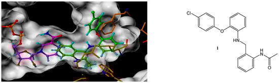 Migration of the N-acetamido group to both the 3 and 4 positions causes the compounds to be pulled towards the cofactor, thus meaning that the hydrophobic headgroup is no longer orientated in the hydrophobic pocket of the enzyme. These changes in alignment may explain the reasons for the lower activity observed with these compounds compared to the 2-substituted acetamide, 1. Compound 19 is inactive probably due to the second chloro-substituent altering the conformation of the diphenylether headgroup.
