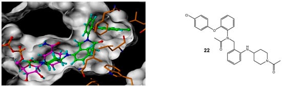 The extended compounds were analysed in silico, and the docking of compounds 22 and 24 is shown in Figure 7. These show that both these compounds are aligned very differently to the shorter compounds without the extra pyridine ring, such as 18.