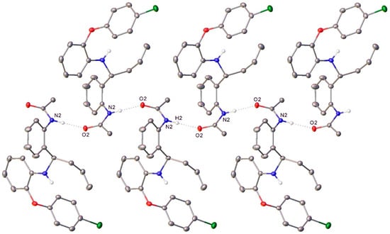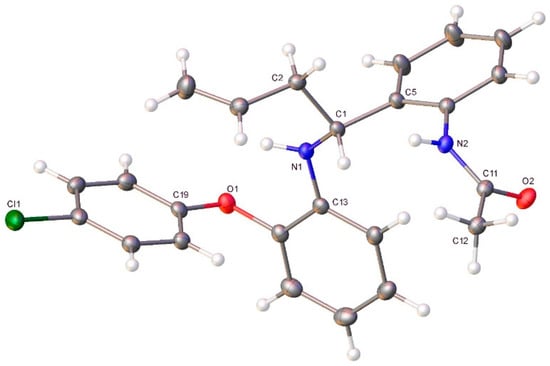 To a solution of N-(2-(1-[2-(4-chloro-phenoxy)-phenylamino]-but-2-enyl)-phenyl)-acetamide, (50 mg, 0.12 mmol) in EtOAc (25 mL) had Pd/C (15 mg) added. The solution was then stirred under a H2 atmosphere for 15 min and filtered through Celite. Purification by flash chromatography (0–50% EtOAc in hexane) afforded the desired product, 44 mg, 88% yield. R.f. 0.42 (EtOAc), LCMS: tr = 3.72 min (90% MeOH in water), m/z M + H 409.00, HPLC: tr = 4.69 min (90% MeOH in water), 99%, 1H NMR (CDCl3, 400 MHz,): δ 0.90 (3H, t, J = 7.6 Hz, CH2CH3), 1.21–1.39 (2H, m, CH2), 1.79–1.86 (2H, m, CH2), 1.87 (3H, s, CH3CO), 4.29 (1H, t, J = 7.6 Hz, CH), 4.37 (1H, br.s, NH), 6.70 (1H, d, J = 8.0 Hz, ArH), 6.73–6.78 (1H, m, ArH), 6.85–6.87 (1H, m, ArH), 6.90–6.96 (3H, m, ArH), 7.11 (1H, t, J = 7.2 Hz, ArH), 7.25–7.31 (4H, m, ArH), 8.05 (1H, d, J = 8.0 Hz, ArH), 9.36 (1H, br.s, NHCO). 13C NMR (CDCl3, 101 MHz): 13.7 (CH3CH2), 19.6 (CH2), 24.4 (CH3CO), 38.0 (CH2), 60.0 (CH), 114.7, 118.3, 119.4, 119.5, 123.0, 124.4, 125.4, 127.9, 128.1, 128.5, 129.9 (ArCH), 130.9, 136.8, 139.3, 143.7, 156.0 (ArC), 168.1 (CO). HRMS: Calcd. for C24H25ClN2O2 (M + H)+ 409.1677, found (M + H)+ 409.1677.