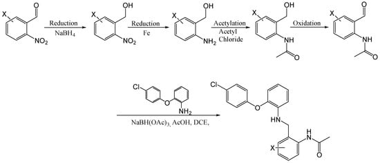 The synthesis of the first target was initiated from commercially available 2-nitrobenzaldehyde, which was reduced to the corresponding primary amine using iron powder (Scheme 1). This intermediate can decompose due to reactions between the amine and the aldehyde functional groups, so it must either be stored in the freezer or quickly used in the next step, which was acetylation of the amine to stabilise the intermediate. The aldehyde can then be reacted with the desired differing headgroup aniline using the standard reductive amination conditions [22] to produce the final compounds.