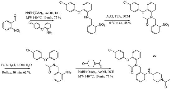 The synthetic route was different to those already used. Since the point of diversification is desired to be the final step in the synthesis, common intermediates are used where possible. Hence, the first step was the reductive amination between the headgroup aniline and 2-nitrobenzaldehyde. This was carried out using our enhanced microwave-assisted conditions [20] and the product was isolated in an excellent 77% yield (Scheme 11). The aniline nitrogen was protected to ensure that it did not interfere with any reactions at the primary amine at a later stage in the synthetic route. The first choice for this protection was an N-t-Boc protecting group; however, only starting material was isolated from this reaction with di-t-butyl-dicarbonate, so another method was required. The small acetyl group was chosen, and formation of the protected amine was successful in 48% yield and iron reduction gave the aniline in 62% yield. The reductive amination with 1-acetyl-4-piperidone produced the desired compound 22 in a good yield of 77%.