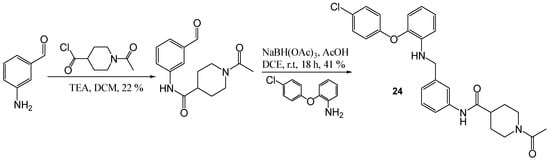 It was then decided to investigate whether this N-acetyl protection was required, or whether the steric constraints and decreased reactivity of the aniline NH were enough to stop potential side reactions from occurring. Therefore, the route was modified (Scheme 12). The reductive amination was carried out with 1-acetyl-4-piperidone. The microwave-assisted reaction occurred successfully, albeit low yielding, to produce the desired 21. Previously, extended compounds in the original amine and amide linked series had been extended using an amide bond. The same primary amine intermediate was, therefore, reacted with 1-acetyl-piperidine-4-carbonyl chloride to produce 23, extended via an amide bond (Scheme 12).
