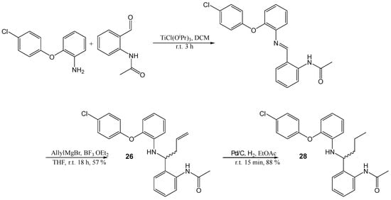 - Gutierrez, C.D.; Bavetsias, V.; McDonald, E. TiCl(OiPr)3 and NaBH(OAc)3: An Efficient Reagent Combination for the Reductive Amination of Aldehydes by Electron-Deficient Amines. Tetrahedron Lett. 2005, 46, 3595–3597. [Google Scholar] [CrossRef]
