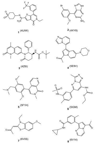 - Karim, R.M.; Chan, A.; Zhu, J.-Y.; Schönbrunn, E. Structural basis of inhibitor selectivity in the BRD7/9 subfamily of bromodomains. J. Med. Chem. 2020, 63, 3227–3237. [Google Scholar] [CrossRef] [PubMed]