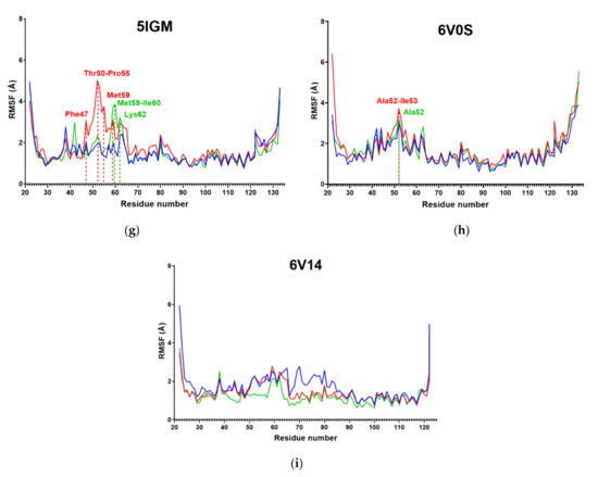 | Docking Score | Interactions a | MM-GBSA | Per-Residue Binding Site b | Per-Residue Total c | Interactions d | RMSD e | RMSF f | Rg g | ||