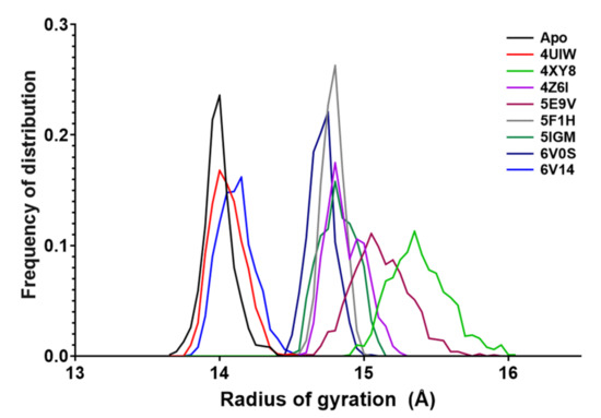 - The radius of gyration is discriminated according to the width of the apo-BRD9 curve (0.72 Å). Values below this threshold are considered positive.