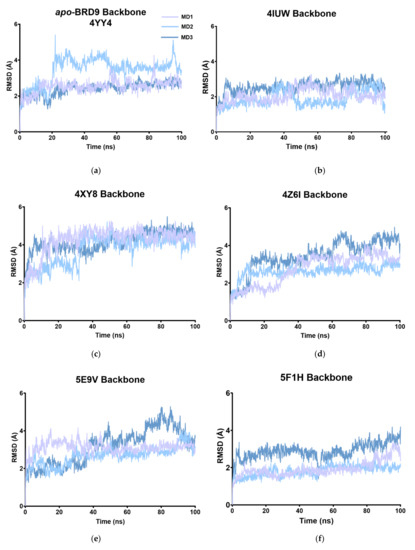 (a–i) RMSD of the backbone atoms of the nine systems referred to the original system. Each simulation was run independently three times, specifically for (a) apo-BRD9, (b) 4UIW, (c) 4XYZ, (d) 4Z6I, (e) 5E9V, (f) 5F1H, (g) 5IGM, (h) 6V0S, (i) 6V14.
