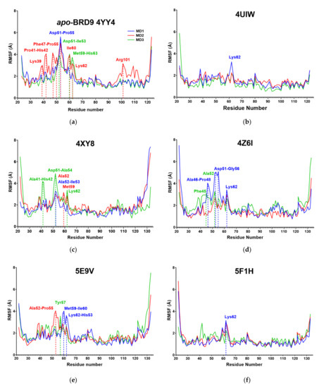 The apo-BRD9 showed predictable mobility of the amino acids forming the binding site, particularly the segment Lys39-Lys62 [18] (Figure 6 and Table 4). This trend was reverted in 4UIW, 5F1H, 6V0S, and 6V14 systems, while some spikes remained in the other protein-ligand complexes. If the mean values of the three MDs were considered, only 4XY8 and 4Z6I showed binding site residues with a fluctuation above 4 Å (Table 4).