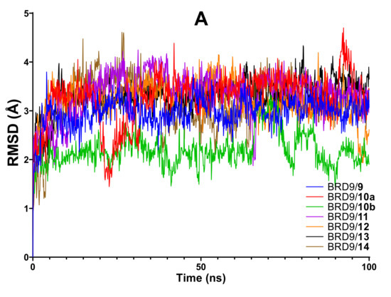 In addition, the RMSF analysis showed no relevant fluctuation, excluding Ala52 and Ile53 (belonging to the binding site) in 13 and Lys62 in 12, indicating instability in connection with these ligands (Figure 12B). The radius of gyration of the first five proteins followed a similar pattern, with the curves being narrow and all centered within 14.60 and 14.75 Å. The system related to compound 14, instead, showed a double-peaked trend and the curve was shorter and wider than the others. The lack of compactness reported may suggest that BRD9/14 is a less stable complex (Figure 12C). Nevertheless, based only on these data, one could not discriminate correctly the molecules tested.