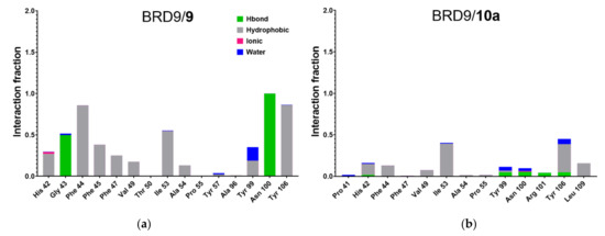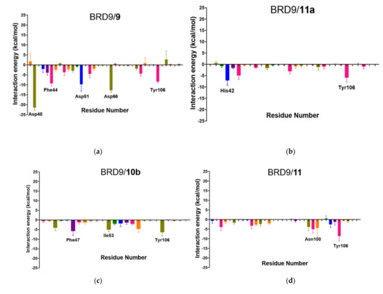 The analysis of the per-residue interactions (Figure 13) provided, as expected, a useful insight into the behavior of each molecule. Specifically, compound 9 received the strongest energetic contribution from Asp40, which, despite not being a key residue in the binding site of BRD9, had interaction energy around −20 kcal/mol; moreover, Phe44 and Tyr106, two crucial binding site amino acids, also showed considerable binding energy. The only relevant energies reported for 11 were computed for Asp100 and Tyr106, while the chaotic and unpaired situation of 12 indicated an unstable binding, particularly due to the high repulsive force generated by Arg101, one of the key residues of the binding site. The binding energies involving other key amino acids were modest and could not counterbalance the two massive disruptive contributions. As assessed before, 10a performed poorly with irrelevant binding energies, following the trend highlighted in the previous steps. This confirmed that the starting binding pose is fundamental, and a wrong choice can greatly influence the predictions. Indeed, 10b shows good binding energies with binding site amino acids, namely Phe47, Asn100, and Tyr106. The two non-bonding compounds (13 and 14) showed a mediocre binding with Phe44, Asn100, and Tyr106, making them comparable with poor binders like 11 or 12, despite 14 having a docking score of −7.94 kcal/mol. Concerning the protein-ligand interactions, the trend highlighted was similar to per-residue interaction energies (Figure 14).