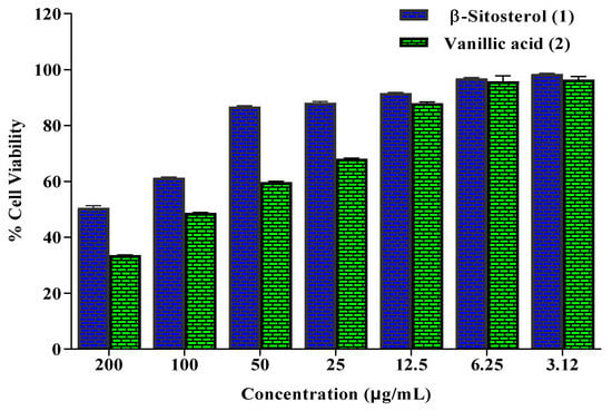 Percentage cell viability of HepG2 cells in MTT assay exhibited by β-sitosterol (1) and vanillic acid (2) isolated from D. bupleuroides.