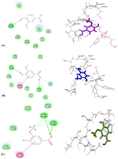 Two-dimensional and 3D binding mode of vanillic acid (2) within the active site of cyclin-dependent kinase 2 (A), matrix metalloproteinase 13 (B), and DNA topoisomerase II (C).