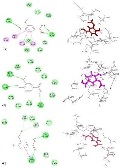 Two-dimensional and 3D binding mode of vanillic acid (2) within the active site of DNA-gyrase (A), dihydrofolate reductase (B), and Aminoglycoside nucleotidyltransferase (C).