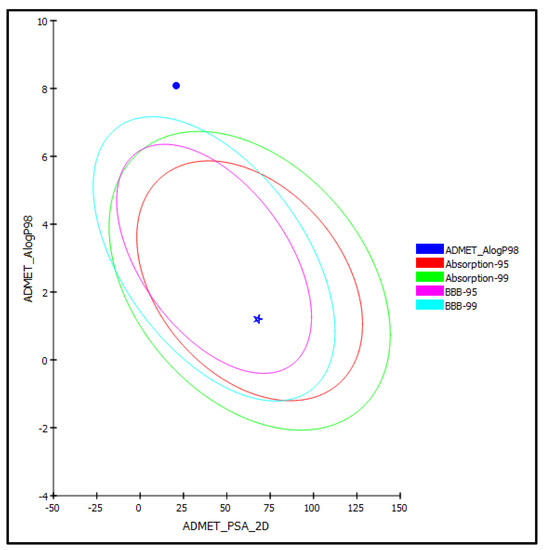 β-Sitosterol (1) and vanillic acid (2) isolated from D. bupleuroides were exposed to AMET determination (absorption, distribution, metabolism, excretion, and toxicity), as well as toxicity evaluation (TOPKAT), to predict their pharmacodynamic, pharmacokinetic, and toxicity properties. Regarding AMET determination, vanillic acid (2) displayed less than 90% plasma protein binding and good human intestinal absorption with optimal solubility and low BBB penetration level. Thus, it lies within the 95% absorption ellipse, as illustrated in the ADMET plot (Figure 5). In contrast, β-sitosterol showed more than 90% plasma protein binding, very low human intestinal absorption, extremely low solubility, and undefined BBB penetration and, thus, lay outside 99% absorption ellipse. Furthermore, both compounds displayed no hepatotoxicity and caused no inhibition to cytochrome P450 2D6 (Table 4). Concerning TOPAKT prediction, both compounds showed no mutagenicity in the chemical Ames mutagenicity test; rat oral LD50 equals 1.57 and 2.39 g/kg.bw for β-sitosterol and vanillic acid, respectively, and chronic rat LOAEL of 0.002 and 0.19 g/kg.bw, respectively. Both compounds showed to be non-carcinogenic towards male NTP rats, but vanillic acid showed certain carcinogenicity towards female NTP rats. β-Sitosterol showed moderate skin irritancy with no irritation to the eye compared to vanillic acid that displayed moderate ocular irritancy with no irritation to the skin. Thus, that vanillic acid exhibited reasonable pharmacodynamic, pharmacokinetic, and toxicity properties and, therefore, could be incorporated in pharmaceutical preparations to counteract cancer and microbial invasion, as well as oxidative stress.