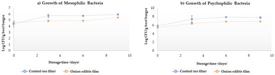 Total aerobic bacteria count (log10 CFU) in bovine beef burger patties uncoated (control) and coated with edible onion performed at different storage times (4 °C). Mesophiles (a) and psychrophiles (b). Each data point represents the mean, and the error bars are the standard deviation (n = 3).