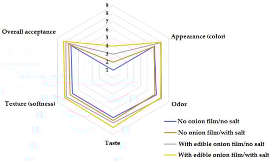 For the sensory evaluation, the beef burger patties with edible onion films applied were divided into 4 treatments from the preparation of the burger: treatment 1—with edible onion films/with salt; treatment 2—with edible onion films/no salt; treatment 3—without edible onion coating/with salt; and treatment 4—without edible onion films/no salt. This was realized to test the action of the edible onion film as a flavoring as it is a widely used condiment in food preparation,
