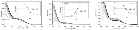 Due to the fact that the triazole linker in CD derivatives contains a basic nitrogen atom that can be protonated at an acidic pH, we determined the value of pKa by UV-Vis spectroscopy. The spectra of βCDGAL, βCDLip, and βCDTriazol, at the pH range between 2.7 and 9.5, are presented on Figure 3. The dependence of the absorbance of the peak maximum at wavelengths in the range of 210–220 on the pH of the buffer is presented in the figures. According to the equation pKa = [CDH+][H+]/[CD] for equal concentrations of the protonated and deprotonated forms, pKa = pH; the pKa value, for all three derivatives containing the triazole linker, was determined to be 4.5. Changing the CD substituent does not affect the acid dissociation constant of the triazole linker. A pKa value of 4.5 means that, at a pH below the pKa value, the CD derivative is usually in protonated form, and its additional positive charge in the triazole ring may affect the strength of the drug binding with the CD derivatives. For the amine derivative CD, the pKa value is available in the literature, and its value equal to 8.84 [32] does not affect the strength of the binding of this cyclodextrin with the drug at the range of physiological pH we tested.