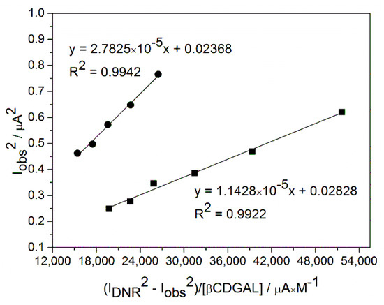 Due to the fact that a cancer cell environment is more acidic (pH 5.5) than that of healthy cells (pH 7.4), the carrier should be pH sensitive to enable the release of the DNR drug. The βCDs with triazole in the side chain were, therefore, chosen to compare the association constants of DNR–cyclodextrin complexes at these two values of pH. The same Osa (Equation (2)) dependencies were used to follow the changes in DNR reduction current in the absence and presence of the CDs. The Osa dependencies of I2obs vs. (I2DNR − I2obs)/[βCDGAL] for the two selected pH values are shown in Figure 7.