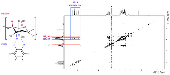 1H NOESY spectrum of the βCDGAL/AQ2S system. The cross-peaks between the H3 and H5 internal protons of βCDGAL and the protons in the aromatic rings of AQ2S are marked by the blue rectangle. In this spectrum, there is a lack of evidence for interactions between the external protons of βCDGAL, i.e., H1, H2, and H4, and protons of the ligand, AQ2S (red rectangles, no signals present). The signal of HDO is marked by an asterisk.