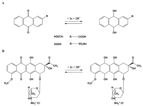 Oxidation and reduction reactions of: (A) AQ2CA and AQ2S; (B) DNR.