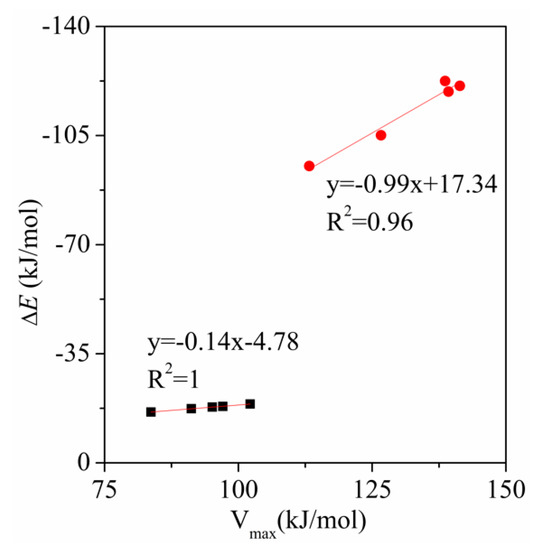 To study the electrostatic nature of the tetrel bonding interaction in the aromatic complexes, we have computed the most positive MEP value of the σ-hole at the C–Si end in the tetrel bond donors. These values are shown in Figure S3 (Supplementary Materials). Also we have represented the MEP values versus the interaction energies of the complexes in Figure 3. We have obtained a good relationship between the interaction energies of the complexes and the MEP values for the electron-donating and electron-withdrawing substituents, respectively. This result clearly indicates that the changes observed in the interaction energies of the complexes due to the different substituents are primarily caused by electrostatic effects. The dominant role of electrostatic interaction is also confirmed by the energy decomposition results (Table S1, Supplementary Materials). Moreover, the slope of the regression plot in the electron-withdrawing substituents is greatly larger than that in the electron-donating substituents, which is similar to that of the relationship between the interaction energy and Hammett constant (Figure 2).