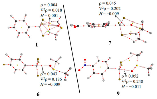 In the complexes of DMSO and p-X-PhSiF3 (X = NH2, OH, CHO, and NO2), there exist other interactions besides a tetrel bond. As expected, the proton of both NH2 and OH groups can form a hydrogen bond with the oxygen atom of DMSO. It is seen from Figure S3 (Supplementary Materials) that there is a π-hole on the carbon atom of –CHO and the nitrogen atom of –NO2, respectively. The π-hole is a region with positive MEPs that is perpendicular to an adjacent portion of the molecular framework [62]. Thus the oxygen atom of DMSO participates in the formation of both a π-hole tetrel bond with the carbon atom of –CHO and a π-hole pnicogen bond with the nitrogen atom of –NO2. The latter interaction has been evidenced in many complexes involving nitro compounds [63,64,65]. We have studied some π-hole tetrel bonds in the complexes of F2CX (X = Se and Te) [17,66]. However, no evidence is found for the π-hole tetrel bonds involving a formyl group. Figure 8 shows the AIM bonding diagrams of these complexes.