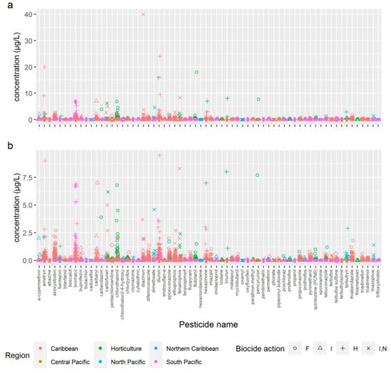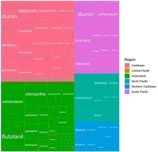 Differences in detection frequencies can be observed within regions in Costa Rica (Figure 1), with a higher frequency of fungicides in the Caribbean > mountain horticulture > South Pacific > North Pacific > Northern Caribbean > Central Pacific. Herbicides were more frequently detected in the South Pacific > Caribbean > North Pacific > Northern Caribbean > horticulture > Central Pacific, while insecticides and nematicides frequencies were highest in the mountain horticulture > Caribbean > South Pacific > Northern Caribbean > North Pacific > Central Pacific. It is noteworthy that the Central Pacific region has a considerably lower sampling effort than other areas, and almost no pesticides were detected in the analyzed samples; however, Rodríguez-Rodríguez et al. [42] conducted an intensive sampling (84 water samples) from 2008 to 2011 in melon and watermelon influenced catchments and found one fungicide and seven insecticides in concentrations that pose an acute and chronic risk to Daphnia magna, fish, and Chironomus riparius. This situation highlights the importance of increasing the sampling effort in that region. Furthermore, the highest individual pesticide frequencies were registered where more sampling effort has occurred; for example, for the horticulture mountain regions, chlorpyriphos was detected in 60% of the samples; in the South Pacific, diuron was detected in 64% and bromacil in 49% of the samples, while in the Caribbean, diuron, ametryn, pyrimethanil, diazinon, and azoxystrobin were detected in >40% of the samples.