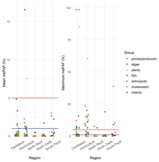 We found that 5% and 13% of the total water samples from all regions of Costa Rica (except the Central Pacific, which had the least sampling effort) pose a high (msPAF > 5%) or moderate (msPAF > 1%) acute risk, respectively, especially to primary producers (plants, algae) and arthropods (insects, crustaceans). Figure 3 shows the mean and maximum msPAF, grouped by region. In the Caribbean, several samples had an extremely high risk for arthropods (insects and crustaceans) and aquatic plants, followed by the horticulture region, South Pacific, Northern Caribbean, and North Pacific.