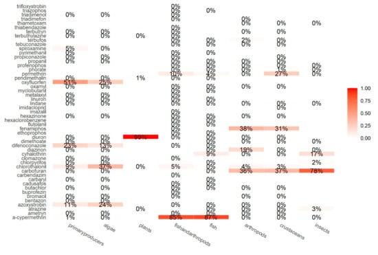 The 72 detected a.i are representatives of several biocide actions and chemical groups, including triazole, benzimidazole, aromatic hydrocarbon, pyridine, imidazole, and chlorinated fungicides; triazine, uracil, urea, oxazolidinone, and triazinone herbicides; organophosphate, organochlorine, pyrethroid, carbamate, thiadiazine, and neonicotinoid insecticides; as well as other acaricides, nematicides, among others They are also representative of a great diversity of toxic modes of action, which is presented in Table S2.