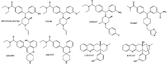 Chemical structure of δOR agonists. BW373U86 (SNC86), SNC80, AZD2327, PN6047, ADL5859, ADL5747, (-)TAN-67 and KNT-127.