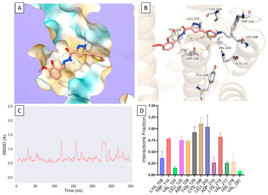 Given the novelty of compound 1′s scaffold, we wanted to model possible interactions of compound 1 at the δOR. We utilized the active-like crystal structure of δOR (PDB: 6PT3 [22]) to perform docking and molecular dynamics (MD) simulations in Schrödinger 2021-1. The crystal structure (6PT3) contains nine thermostabilizing mutations, three of which are near at the sodium binding pocket (N 902.45, D 952.50, N 1313.35) and near ECL2 in transmembrane helix 2 (TM2) (Q1052.60 and K1082.62). Subsequently, we reverted all nine mutations to the wild-type (WT) residues (see methods and Supplementary Material). Our initial docking suggested that the thiophene ring of compound 1 occupies a hydrophobic pocket near the orthosteric site formed by W114ECL1, V1243.28, L1253.29, C198ECL2 where it forms ionic bonds with K1082.63 and hydrophobic interactions with W114ECL1 and C198ECL2 (Figure 5A). Additionally, compound 1 appeared to extend further into the orthosteric site where it was in proximity to and interacted with D1283.32, Y1293.33 and Y3087.42 (Figure 5B). To confirm the initial docked poses, we docked compound 1 into multiple potential binding sites generated using SiteMap and confirmed similar interactions with residues within the hydrophobic pocket (Supplementary Figure S1). We then decided to further model the interactions of compound 1 at δOR using dynamic structures where we performed three independent all-atom MD simulations which showed a relatively stable pose for compound 1 where it interacts with residues in TM2, ECL1, TM3 and ECL2 (L200ECL2) and occasionally with residues in TM5 (K2145.40) and TM7 (Figure 5C,D, Supplementary Figures S2 and S3).