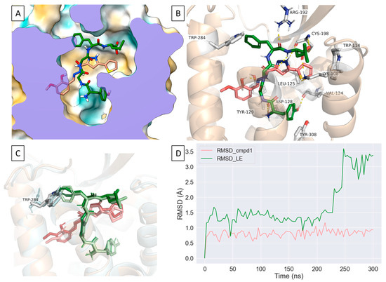 Molecular dynamic simulation of Compound 1 bound to the δOR in the presence of Leu-enkephalin. (A). a representative binding pose for compound 1 in the presence of Leu-enkephalin obtained from a 300 ns MD simulation where compound 1 stably occupies the partially hydrophobic pocket. (B). Leu-enkephalin forms H-bonds and water mediated interactions with K1082.63, D1283.32, R192ECL2, C198ECL2, H3017.35, C3037.37 and hydrophobic interactions with Y3087.42 whereas compound 1 mostly interacts with W114ECL1, L1253.29, C198ECL2 and L200ECL2 and K2145.40. (C). Poses of Leu-enkephalin and compound 1 showing the first frame of a 300 ns MD simulation (Leu-enkephalin: light green, compound 1: light pink, W284: cyan) aligned on the clustered poses of Leu-enkephalin and compound 1 (Leu-enkephalin: dark green, compound 1: red, W2846.58: light grey). (D). A rolling average of 3 ns of the RMSD of compound 1 in the presence of Leu-enkephalin obtained from a 300 ns MD simulation showing a relatively stable pose for compound 1 whereas the disruption of Leu-enkephalin’s interaction with W2846.58 causes a relatively large change in its RMSD.