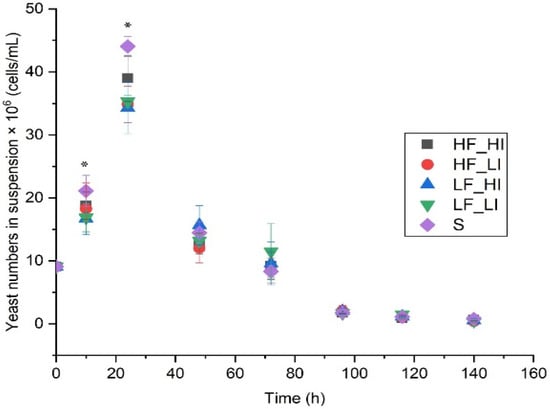 Yeast numbers in suspension (viable cells) were estimated at 0, 10, 24, 24, 48, 72, 96, 120, and 144 h over the course of the fermentation for the five treatment conditions using the protocol described above (Section 3.2.1).