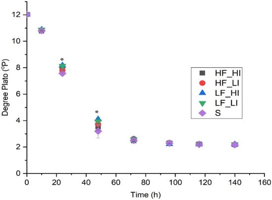 A general decrease in wort gravity (measured according to density; °P) was observed for all treatments over the 144-h fermentation. There were significant differences among treatments at 24 and 48 h (Figure 2) before all treatments converged to the same gravity at 72 h, and reached final gravity (2.23 ± 0.06 °P) by 144 h. After 24 h, two treatments (LF_LI, LF_HI) showed higher gravity than the silence, namely HF_HI and HF_LI treatments (24 h, Table S2 Supplementary Material). After 48 h, samples from the silence group had the lowest gravity (3.20 ± 0.06 °P), which was significantly lower than the LF_HI treatment but not the remaining treatments.