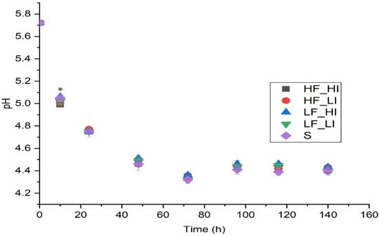 In the current study, pH decreased from 5.72 ± 0.01 to 4.40 ± 0.01 during fermentation, as expected [19] (Figure 3). There was only a statistical difference in pH between samples at 10 h for LF_HI and HF_HI, although the difference was very small (<0.1 pH unit). In beer production, pH is an essential factor because it influences yeast behavior and the synthesis of metabolites (alcohols, esters, etc.).