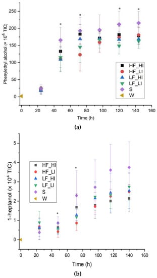 For the higher alcohols (HAs), the application of some of the sound treatments tended to decrease their synthesis, specifically for 2-methyl-1-propanol, 2-methyl-1-butanol, 3-methyl-1-butanol, 1-hexanol, and phenylethyl alcohol relative to the silence condition at each fermentation time point. For example, phenylethyl alcohol had a significantly higher (p < 0.05) abundance (higher peak area) in the silence control relative to treated samples at 48 (HF_LI, LF_HI, LF_LI), 72 (HF_LI, LF_LI), 120 (LF_LI), and 144 h (LF_HI, LF_LI) (Figure 4a; Table A1). These results suggest that sound treatment could potentially be utilized to reduce the concentration of phenylethyl alcohol. In addition, at 48 h, HF_LI had a significantly lower (p < 0.05) abundance of 1-heptanol (Figure 4b), relative to the silence control. Likewise, HF_LI-treated samples had a significant (p < 0.05) reduction in abundance of 1-heptanol at 72 h. At 144 h, HF_LI and the silence control had a higher abundance of 2-methyl-1-butanol compared to the rest of the treatments (i.e., HF_HI, LF_HF, LF_LI). However, the abundance of 2-methyl-1-butanol and 1-hexanol converged at the end of the fermentation (144 h), thus resulting in no differences in their abundance being detected in the final beer (p > 0.05). It has been previously reported that the predominant HAs in beer are 3-methyl-1-butanol (60–80%), 2-methyl-1-propanol (15–25%), and 1-propanol (4–7%), which are formed as byproducts during biosynthesis of amino acids [23,24,25]. Amino acid biosynthesis has previously been reported to be upregulated as a result of sound treatments (music and low-frequency sound (100 Hz, 92 dB @ 20 µPa) [3]. The decrease in HAs synthesis at certain sampling times during fermentation observed in this study may be due to inhibition of aminotransferases, pyruvate decarboxylases (pdc1, pdc5, and pdc6), and alcohol dehydrogenases (Adh1, Adh2, Adh3, Adh4, and Adh5 or Sfa1) [26,27].