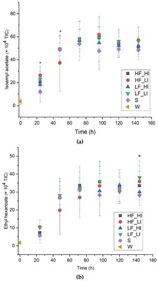 Abundance of esters during fermentation for five sound treatments, including a silent control. (a) Isoamyl acetate (A6); (b) ethyl hexanoate (A10). Low-frequency and low-intensity (LF_LI); low-frequency and high-intensity (LF_HI); high-frequency and low-intensity (HF_LI); high-frequency and high-intensity (HF_HI); silence (S); wort (W). The results shown are means ± standard deviations of six measurements (3 biological fermentation replicates × 2 analytical replicates). Total Ion Chromatogram (TIC). * Significant difference observed among treatments (Table A1).