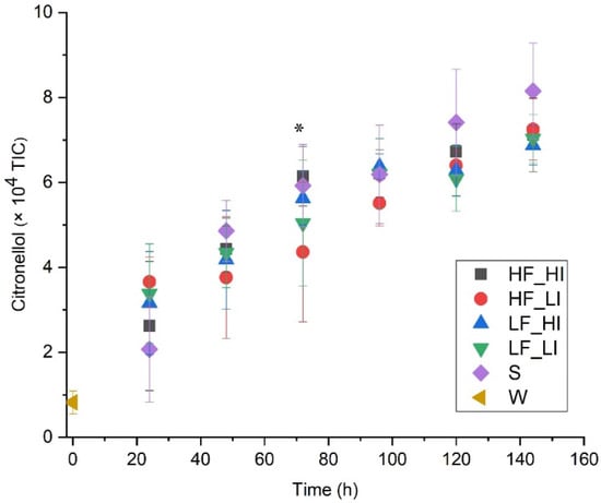 Abundance of Citronellol (A25) during fermentation for five sound treatments including a silent control. Low-frequency and low-intensity (LF_LI); low-frequency and high-intensity (LF_HI); high-frequency and low-intensity (HF_LI); high-frequency and high-intensity (HF_HI); silence (S); wort (W). The results shown are means ± standard deviations of 6 measurements (3 biological fermentation replicates × 2 analytical replicates). * Significant difference observed among treatments (see Table A1).