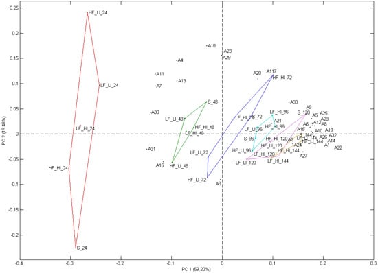 Principal component analysis (PCA) was performed to visualize the relationships between treatments, fermentation time and the VOCs identified (Figure 7). The first two principal components, PC1 and PC2, accounted for 75.68% of the total variability. Fermentation time (h) dominated the explained variance and explained the separation on PC1, where ferments at 24 h (on left) were separated from ferments at 144 and 120 h (on right), specifically S_120, S_144, HF_LI_144, and LF_LI_144. On PC1, the majority of VOCs had high positive loadings and contributed more to the separation of samples on PC1 than the VOC with negative loadings. The compounds that were most positively associated with fermentation time at S_120, S_144, HF_LI_144, and LF_LI_144 on PC1 were 3-methyl butyl octanoate, phenylethyl acetate, ethyl acetate, ethyl octanoate, ethyl 9-decenoate, ethyl, and 1-heptanol. Some yeast metabolites are produced and accumulate during fermentation. Samples at 24 and 48 h (connected by red and green lines) were associated with a lower abundance of the above compounds and positively associated with a higher abundance of 2,2,4-trimethyl-1,3-pentanediol isobutyrate, ethyl 1-hexanol, ethyl dodecanoate, 2-methylbutyl isobutyrate, and methyl 4-methylenehexanoate. Separation on PC2 was primarily due to HF_LI and silence conditions at 24 h of fermentation time. This separation was largely related to the positive loadings of linalool, the unknown terpene alcohol (A23, 21.18 min), 2-methylbutyl isobutyrate, and geraniol, which indicates higher levels of these compounds in HF_LI treatment at 24 h. A decrease in hop-derived VOCs was also observed as fermentation time increased (Table A1).