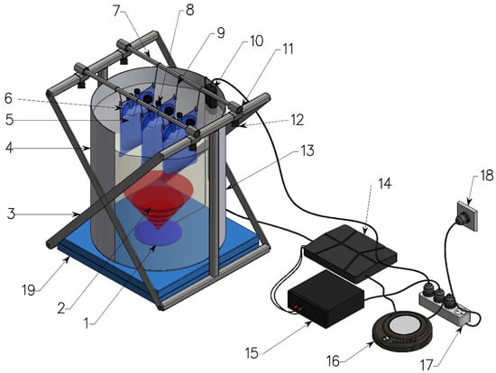 Experimental setup. 1. underwater speaker; 2. sound travelling via water; 3. support stand; 4. water level; 5. pitched wort; 6. submerged fabricated wine bag; 7. cross beam; 8. an airlock; 9. rubber band attached to hook for acoustically isolating suspended wine bag; 10. aquatic water heater; 11. foam tube; 12. adjustable knob; 13. plastic cylindrical container; 14. 1000 W power amplifier; 15. power adapter; 16. CD player; 17. multiple outlet extension cord; 18. wall socket; 19. foam pads for sound proofing.