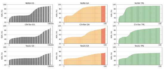 As shown in Figure 1, the overall non-error rate (NERT) associated with the architectures generated by all the possible combinations of hyperparameters at the considered levels (i.e., GS results, 196,608 combinations) has peculiar distributions for each dataset. In particular, the NURA dataset seems to be easier to model with a half of the architectures (46%) providing a NERT greater than 60%, while for the Tox21 and ClinTox dataset, this fraction was reduced 21% and 25%, respectively.