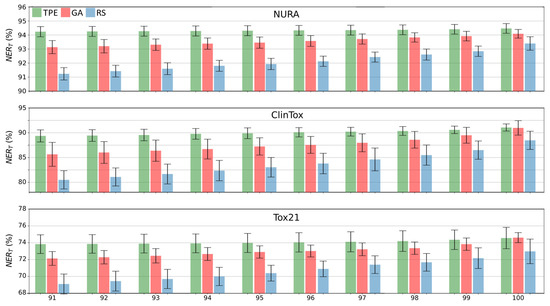GA (second column in Figure 1) was shown to be able to converge after a few generations starting from an initial population of ten chromosomes. The difference between the NERT for GA and the best GS solution was between 1% (for NURA) to 3% (for ClinTox) (Table 1). TPE (third column in Figure 1) seems to explore the hyperparameter space more effectively than GA, yielding satisfactory results for most trials. However, the best TPE combinations provide NERT comparable to GA, with an average difference always less than 0.5%.