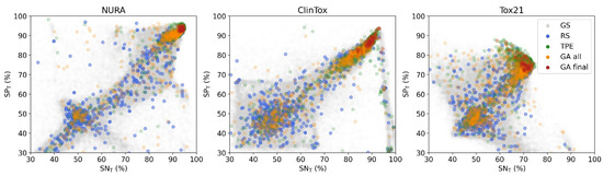 This time, the best solutions found by GA and TPE were significantly different from those provided by RS in terms of NERT according to a t-test (at a 95% confidence level) for two of the three datasets (NURA and Tox21, see Appendix, Table A4, Table A5 and Table A6). For the ClinTox dataset, both GA and TPE results were comparable to the RS ones; indeed, all three approaches provided a NERT 9% lower on average than the best GS result. For the other two datasets, GA and TPE provided better results in terms of NERT, with only 1% and 2% differences from the best GS solution for the NURA and Tox21 datasets, respectively. GA and TPE provided comparable results in terms of NERT for all datasets. In general, TPE tends to provide solutions showing a slightly higher SPT and a slightly lower SNT than GA.