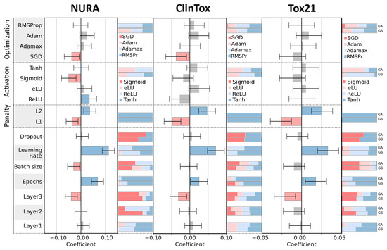 SGD, as an optimization algorithm, had a large negative coefficient value for NURA and ClinTox; sigmoid as activation function should be avoided for the NURA dataset due to its negative coefficient. Again, there was a good qualitative correspondence between the D-optimal coefficients and the GA/GS frequency bars. In particular, SGD was absent from the best GA and GS results for the NURA dataset and present only in 4% and 2% of the best GA and GS ClinTox architectures, respectively.